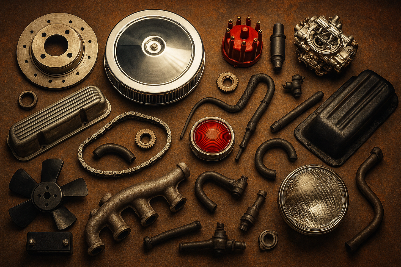 Todo tipo de peças, carroceria, mecanica, eletricidade, manuais tecnicos, apoio tecnico, conte conosco para restauro ou peças para classicos americanos.